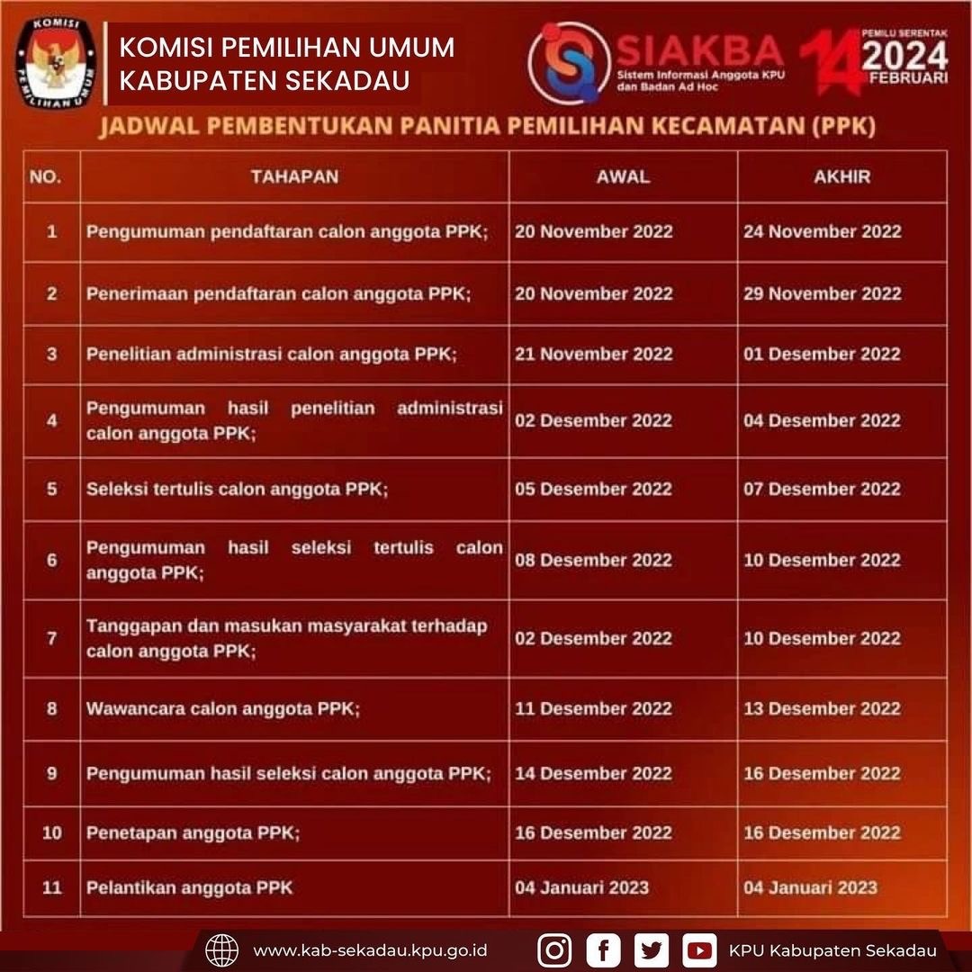 Berikut disampaikan jadwal Pembentukan Panitia Pemilihan Kecamatan (PPK) untuk Pemilu Serentak Tahun 2024.
