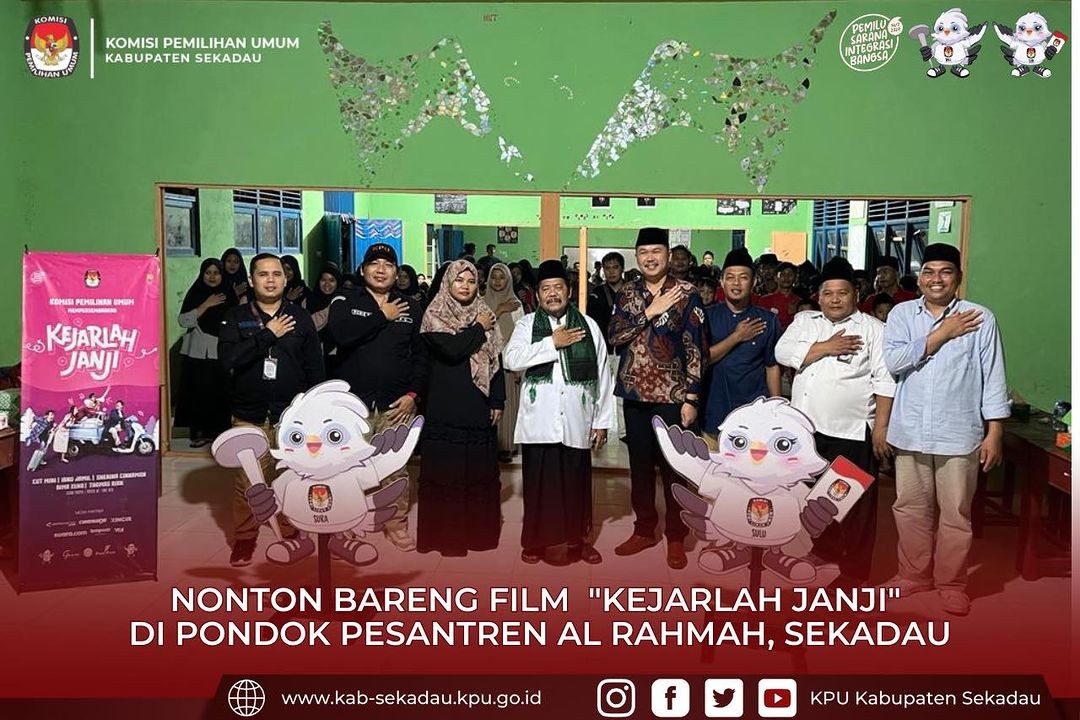 Kegiatan Nonton Bareng Film berjudul "Kejarlah Janji" KPU melalui KPU Kabupaten Sekadau dihadiri Ketua dan anggota KPU Kab. Sekadau, Ketua Bawaslu, Pimpinan pondok pesantren dan santri wan dan santri Wati pondok pesantren Al Rahmah berjumlah 100 Peserta.