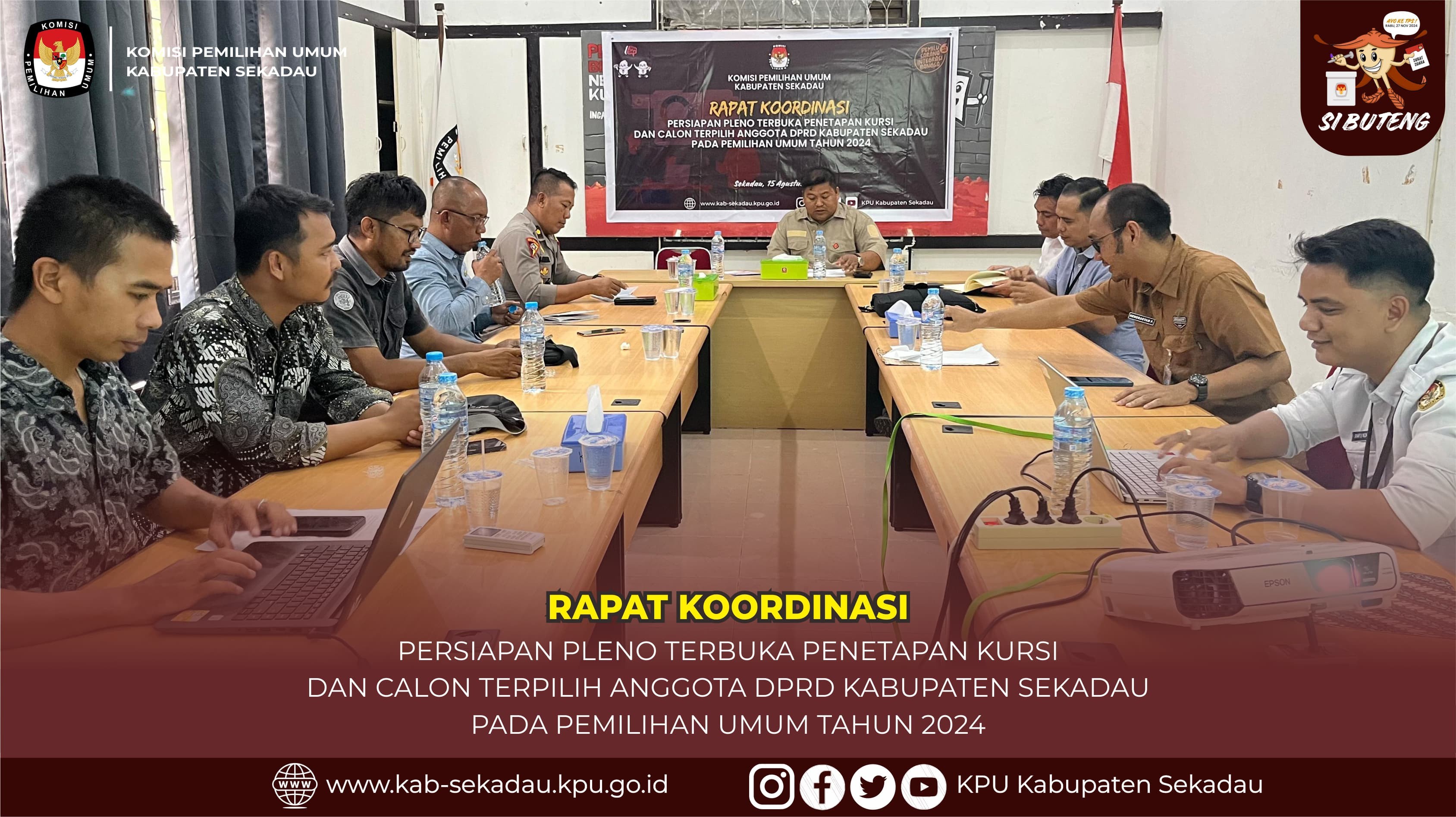 Komisi Pemilihan Umum (KPU) Kabupaten Sekadau mengadakan rapat koordinasi untuk mempersiapkan rapat pleno terbuka penetapan kursi dan calon terpilih anggota DPRD Kabupaten Sekadau dalam Pemilihan Umum 2024. Rapat ini digelar di ruang rapat KPU Sekadau pada Kamis, (15/8).