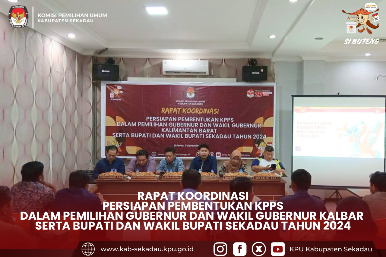 Komisi Pemilihan Umum (KPU) Kabupaten Sekadau mengadakan Rapat Koordinasi (Rakor) dalam rangka persiapan pembentukan Kelompok Penyelenggara Pemungutan Suara (KPPS) menjelang Pemilihan Gubernur dan Wakil Gubernur Kalimantan Barat serta Pemilihan Bupati dan Wakil Bupati Sekadau tahun 2024. Acara ini berlangsung pada hari Minggu, (8/9). kegiatan ini digelar di Aula Hotel Pondok Indah, Sekadau.