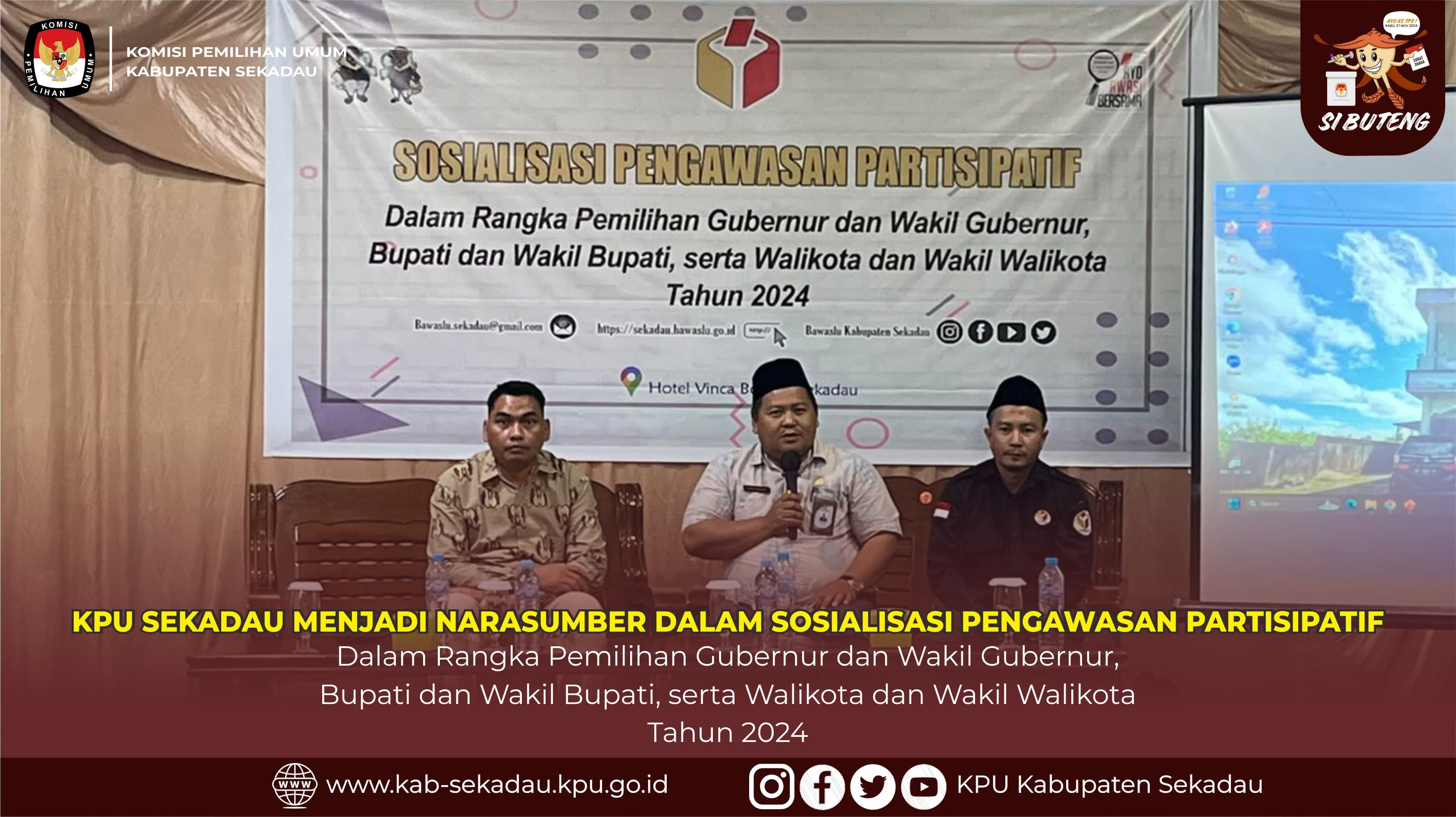 Dalam rangka mempersiapkan pemilihan Gubernur dan Wakil Gubernur Kalimantan Barat serta Bupati dan Wakil Bupati Kabupaten Sekadau tahun 2024, Bawaslu Kabupaten Sekadau menggelar sosialisasi pengawasan partisipatif di Hotel Vinca Borneo. Acara yang diadakan Kamis (25/7) ini menghadirkan Nur Soleh, anggota KPU Kabupaten Sekadau Divisi Hukum dan Pengawasan, sebagai pemateri.