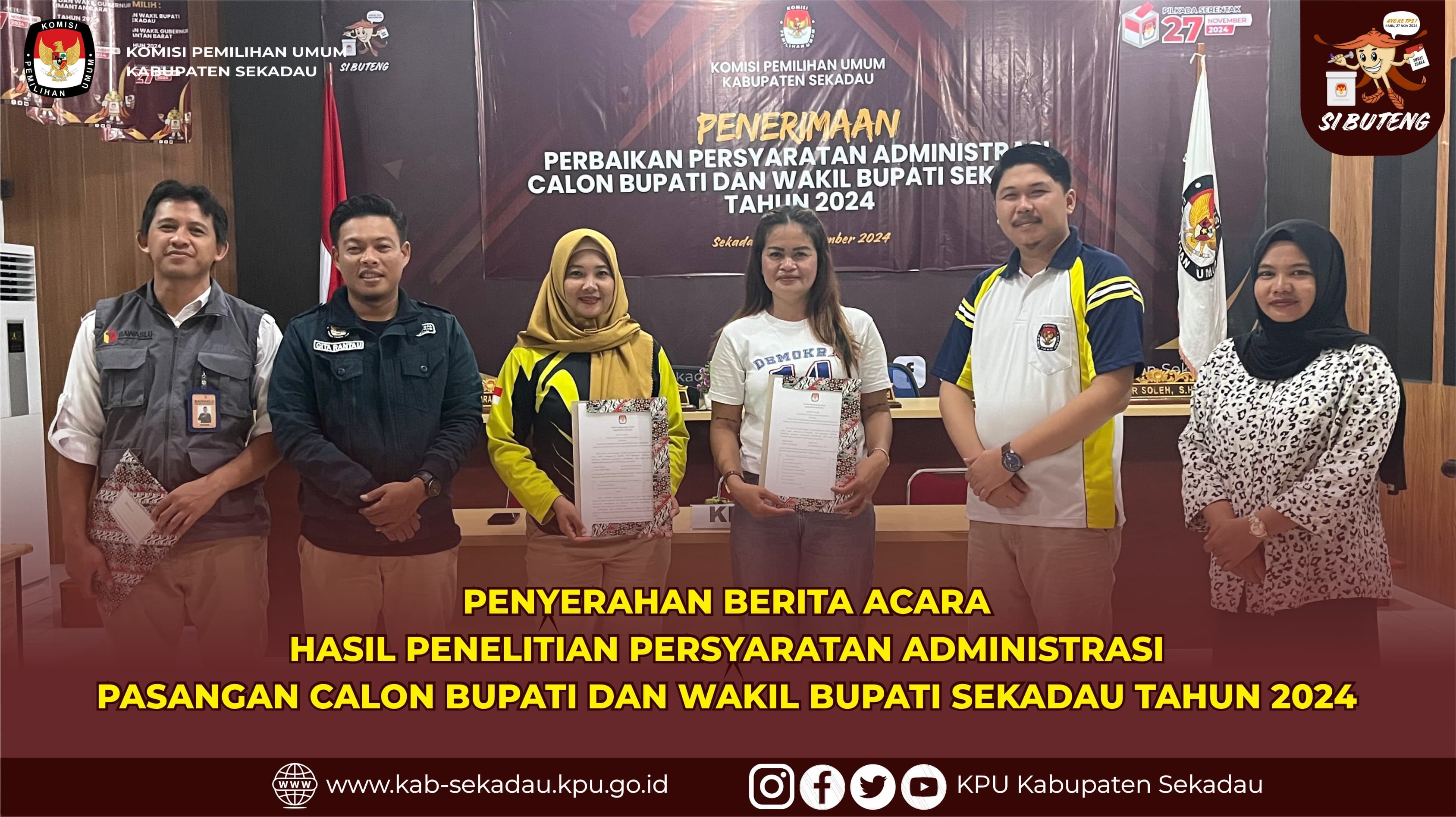 Komisi Pemilihan Umum (KPU) Kabupaten Sekadau melaksanakan penyerahan Berita Acara hasil penelitian persyaratan administrasi kepada perwakilan pasangan calon Bupati dan Wakil Bupati Sekadau. Acara ini berlangsung pada Jumat (13/9), bertempat di Aula Kantor KPU Sekadau.