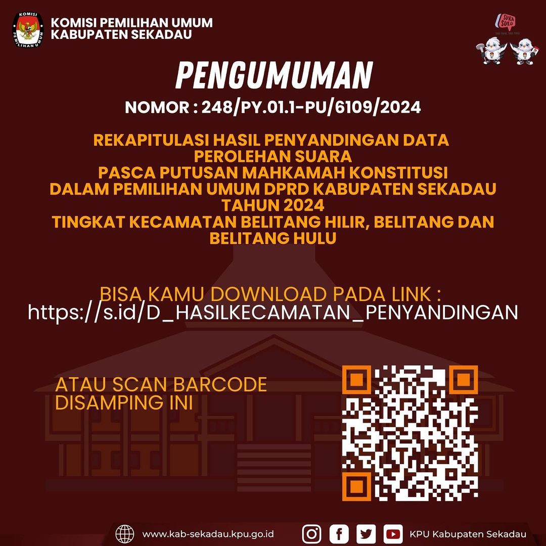 Dalam rangka Menindaklanjuti Putusan Mahkamah Konstitusi Nomor 151-01-10-20/PHPU.DPR-DPRD-XXII/2024, KPU Kabupaten Sekadau telah melaksanakan Rekapitulasi Hasil Penyandingan Data Perolehan Suara Pasca Putusan Mahkamah Konstitusi dalam Pemilihan Umum DPRD Kabupaten Sekadau Tahun 2024 Tingkat Kecamatan Belitang Hilir, Belitang dan Belitang Hulu, KPU Kabupaten Sekadau Mengumumkan Formulir D.HASIL KECAMATAN-DPRD-KAB/KOTA sebagaimana terlampir pada link : https://s.id/D_HASILKECAMATAN_PENYANDINGAN atau scan barcode pada infografis.