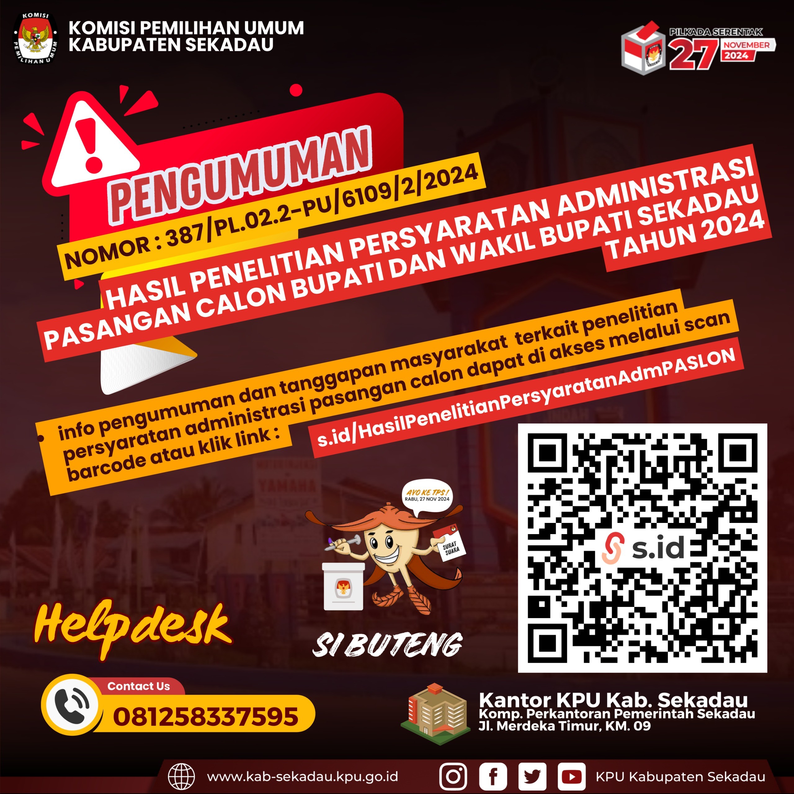 #TemanPeilih, Berikut Pengumuman Hasil Penelitian Persyaratan Administrasi Pasangan Calon Bupati dan Wakil Bupati Sekadau Tahun 2024, dapat diakses melalui scan barcode infografis atau link : s.id/HasilPenelitianPersyaratanAdmPASLON