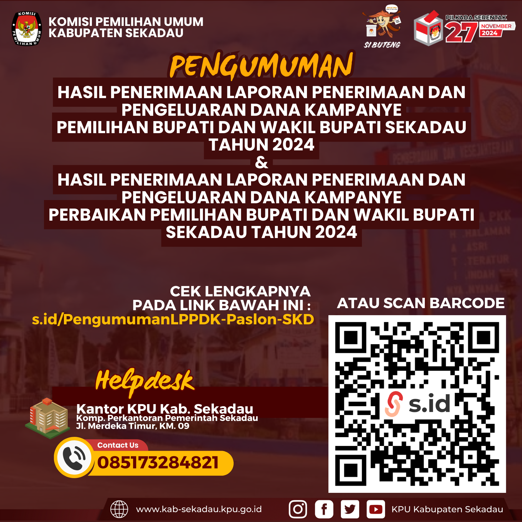 Berdasarkan Tanda Terima dan Berita Acara Penerimaan LPPDK Pasangan Calon Bupati dan Wakil Bupati Sekadau Tahun 2024 serta Berdasarkan Tanda Terima dan Berita Acara Penerimaan LPPDK Perbaikan Pasangan Calon Bupati dan Wakil Bupati Sekadau Tahun 2024, disampaikan pada link s.id/PengumumanLPPDK-Paslon-SKD
