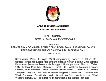 PENGUMUMAN NOMOR : 143/PL.02.2-Pu/6109/2/2024 TENTANG PENYERAHAN DOKUMEN SYARAT DUKUNGAN BAKAL PASANGAN CALON PERSEORANGAN BUPATI DAN WAKIL BUPATI SEKADAU TAHUN 2024