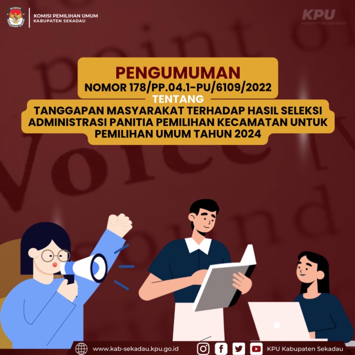 Pengumuman Nomor 178/PP.04.1-Pu/6109/2022 Tentang Tanggapan Masyarakat Terhadap Hasil Seleksi Administrasi Panitia Pemilihan Kecamatan untuk Pemilihan Umum Tahun 2024