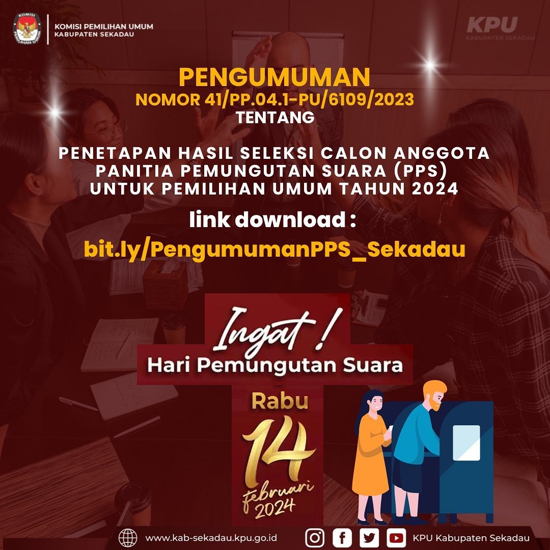 Pengumuman Nomor 41/PP.04.1-Pu/6109/2023, Tentang Penetapan Hasil Seleksi Calon Anggota Panitia Pemungutan Suara (PPS) untuk Pemilihan Tahun 2024