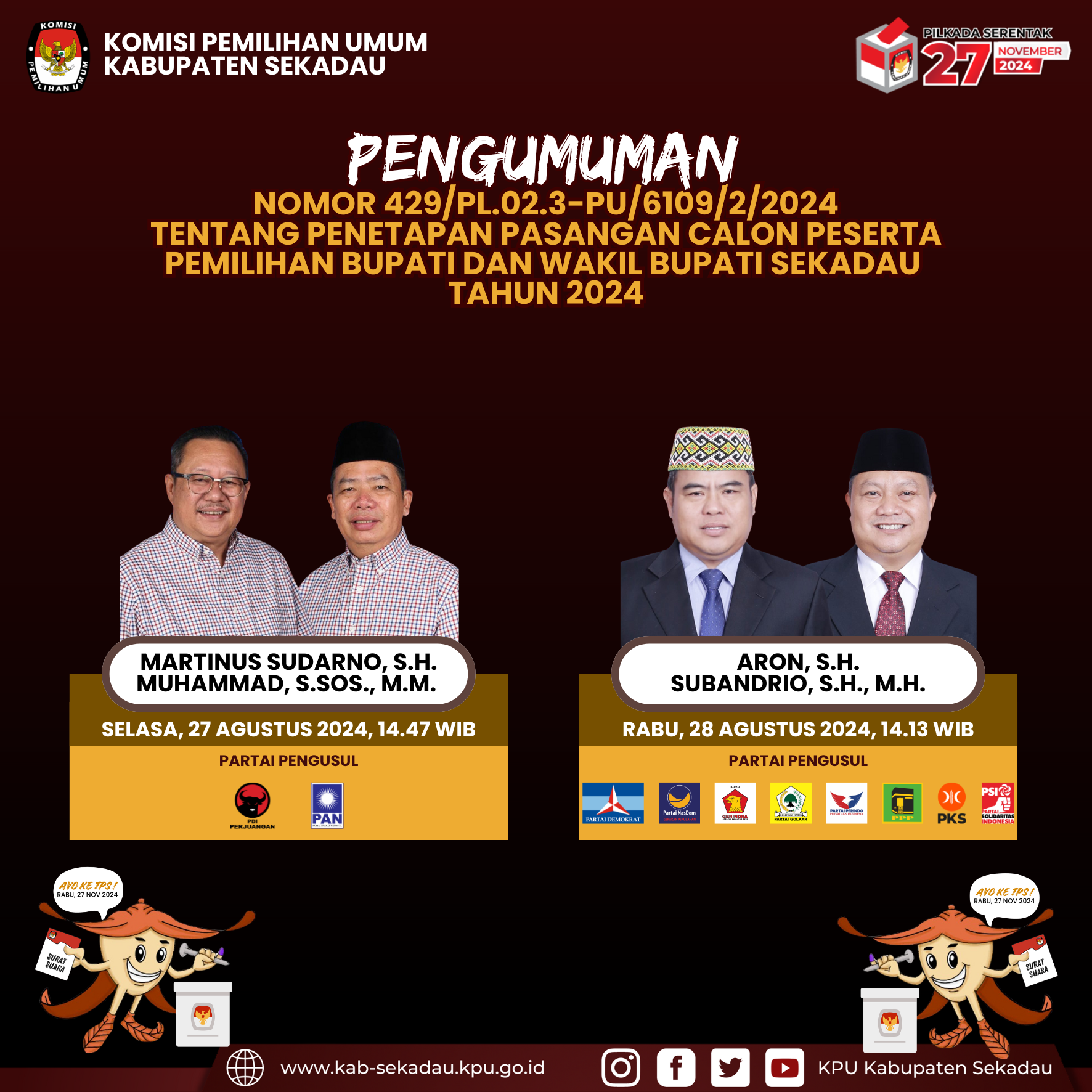 Pengumuman Penetapan Pasangan Calon Bupati dan Wakil Bupati Sekadau untuk Pilkada Serentak 2024