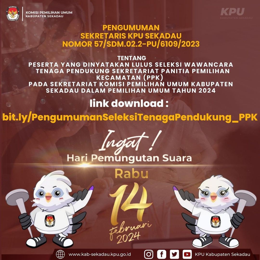 PENGUMUMAN SEKRETARIS KPU SEKADAU NOMOR 57/SDM.02.2-PU/6109/2023