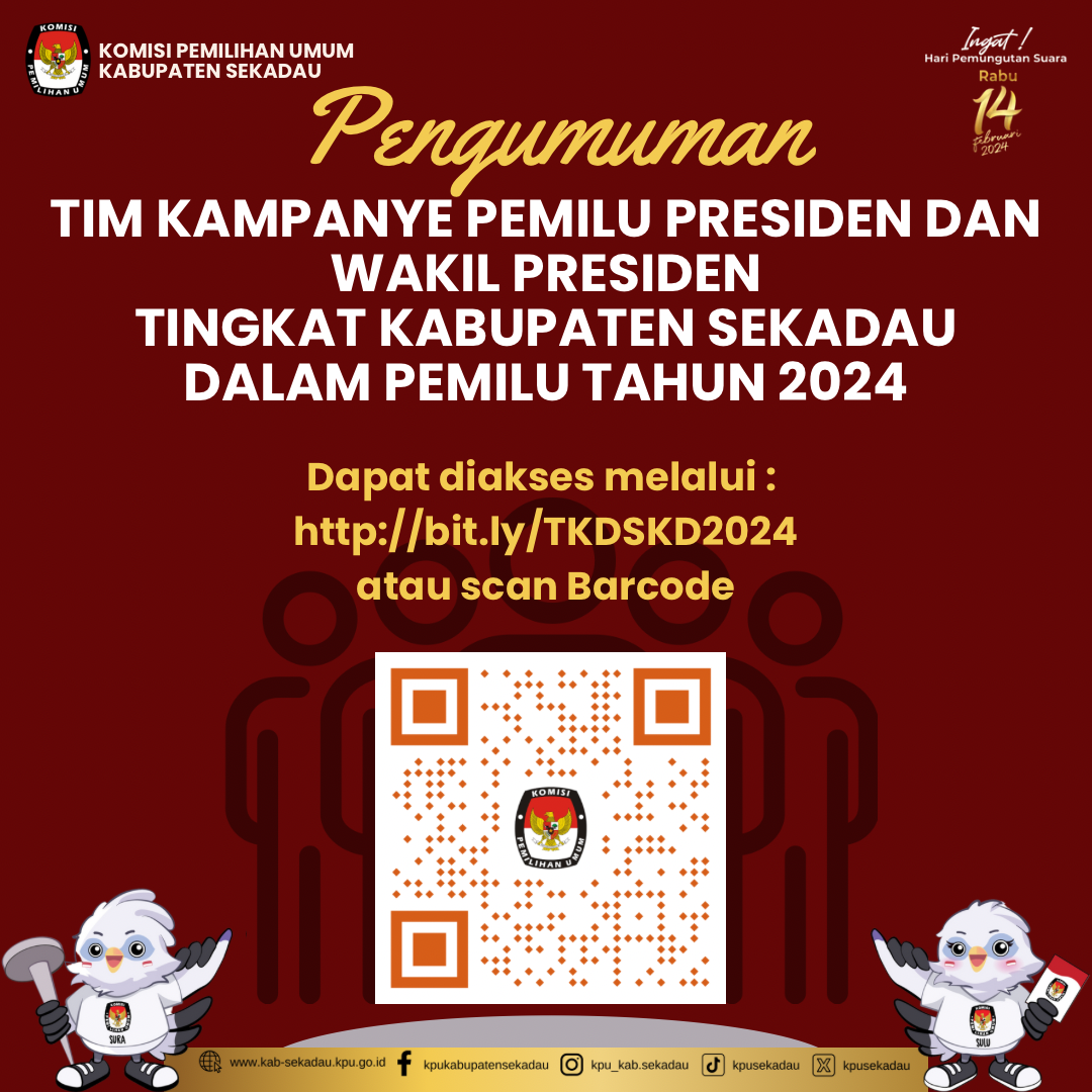 Pengumuman Tim Kampanye Pemilu Presiden dan Wakil Presiden Tingkat Kabupaten Sekadau Pemilihan Umum Tahun 2024 bisa dilihat DISINI