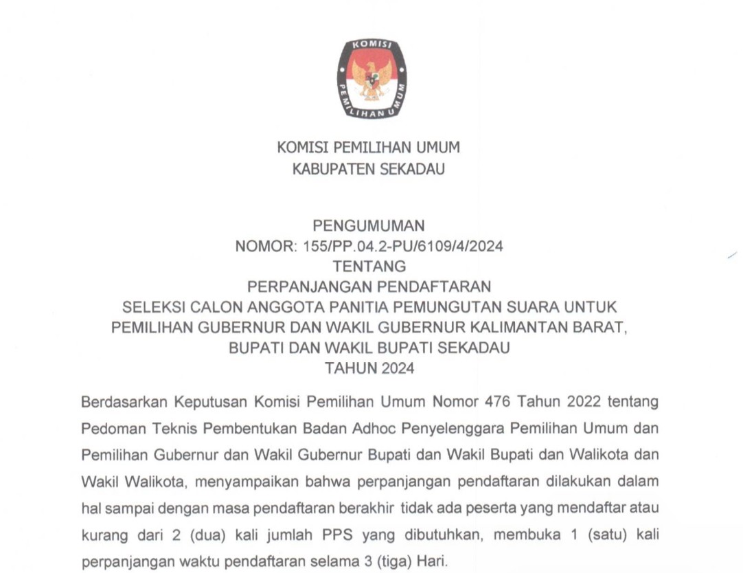 PERPANJANGAN PENDAFTARAN SELEKSI CALON ANGGOTA PANITIA PEMUNGUTAN SUARA UNTUK PEMILIHAN GUBERNUR DAN WAKIL GUBERNUR KALIMANTAN BARAT, BUPATI DAN WAKIL BUPATI SEKADAU TAHUN 2024