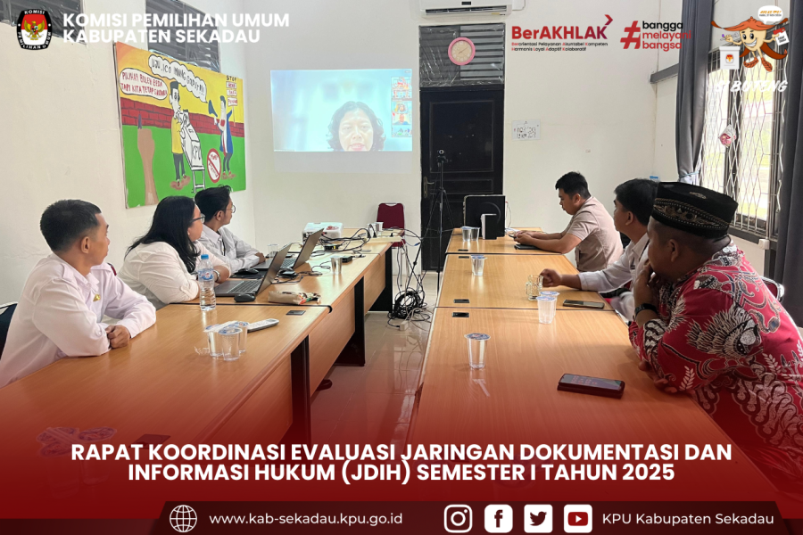Komisi Pemilihan Umum (KPU) Kabupaten Sekadau mengikuti Rapat Koordinasi Evaluasi Jaringan Dokumentasi dan Informasi Hukum (JDIH) Semester I Tahun 2025 yang diikuti oleh seluruh KPU Kabupaten/Kota se-Kalimantan Barat. Kegiatan strategis ini menjadi momentum penting untuk memperkuat sinergi antar-satuan kerja dalam meningkatkan kualitas pengelolaan dokumentasi dan penyebaran informasi hukum di lingkungan KPU.