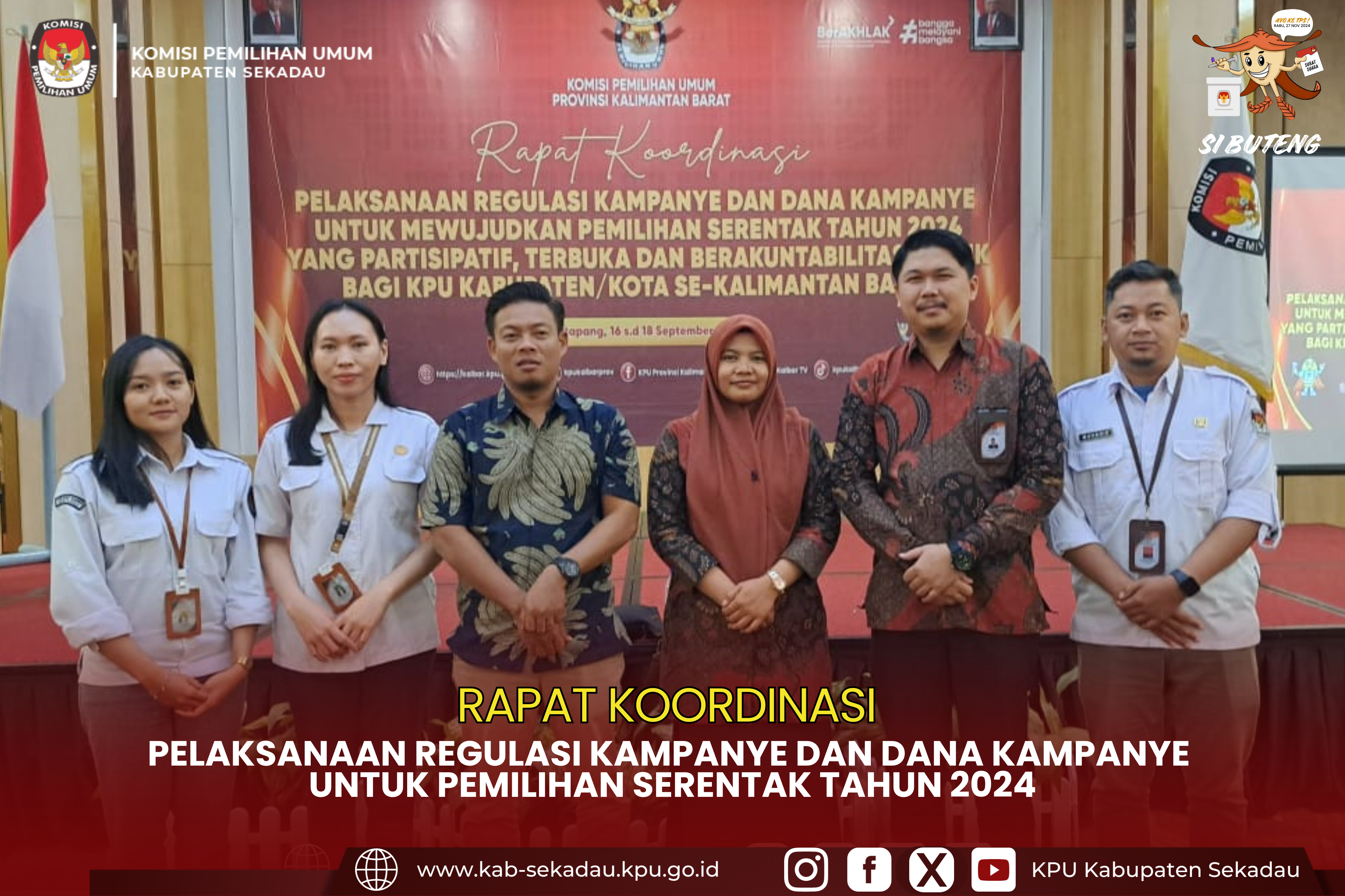 KPU Kabupaten Sekadau menghadiri Rapat Koordinasi Pelaksanaan Regulasi Kampanye dan Dana Kampanye untuk mewujudkan Pemilihan Serentak Tahun 2024 yang Partisipatif, Terbuka dan Berakuntabilitas Publik bagi KPU Kabupaten/kota se-Kalimantan Barat, bertempat di Hotel Grand Zuri Ketapang pada tanggal 16 sd 18 September 2024.