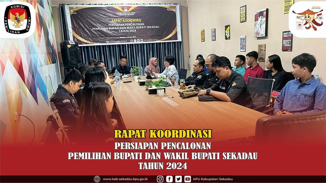 Komisi Pemilihan Umum (KPU) Kabupaten Sekadau mengadakan rapat koordinasi persiapan pencalonan pemilihan Bupati dan Wakil Bupati Sekadau tahun 2024. Acara yang digelar di Luppung Coffee Sekadau ini dihadiri oleh Kepala Badan Perencanaan Pembangunan Daerah (Bappeda) Sekadau, Ketua Badan Pengawas Pemilu (Bawaslu) Sekadau, serta Sekretaris Badan Kesatuan Bangsa dan Politik (Kesbangpol) Sekadau.