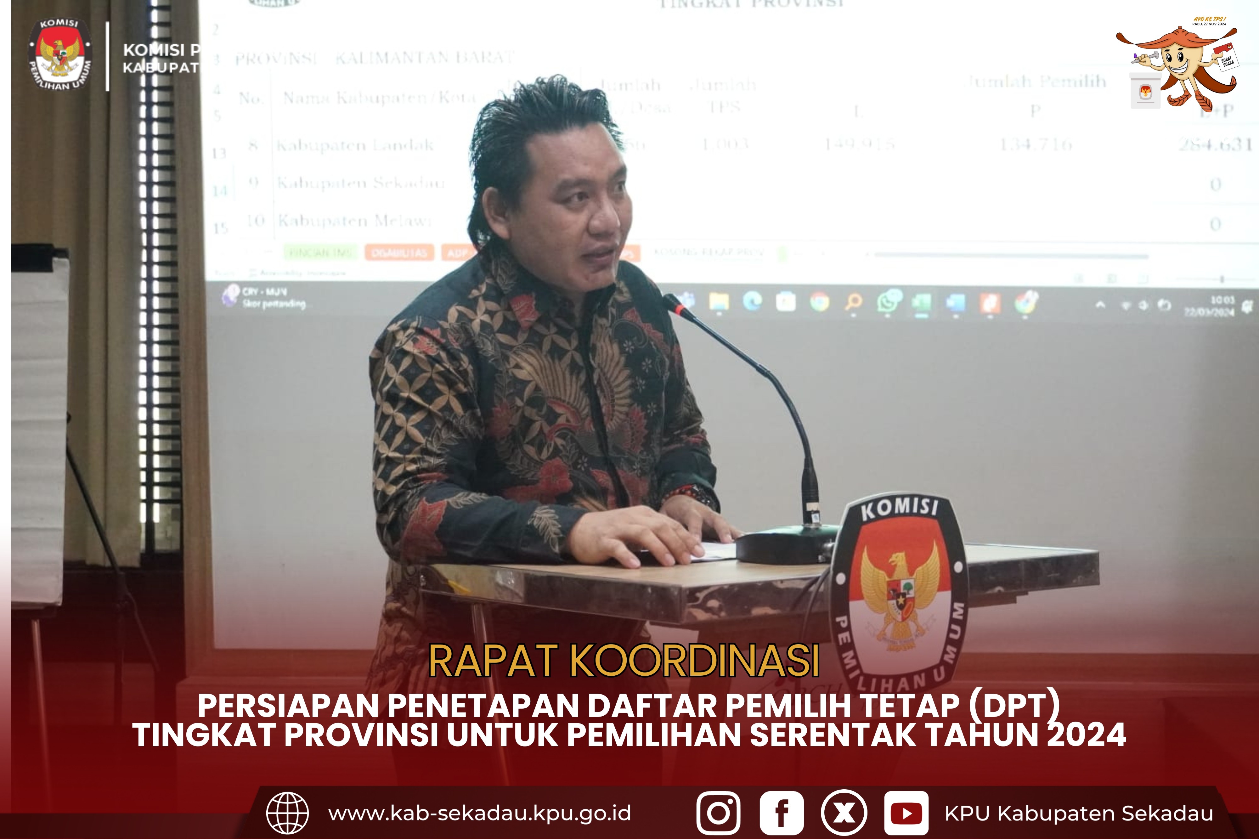 Rapat Koordinasi Persiapan Penetapan Daftar pemilih Tetap (DPT) tingkat Provinsi dalam Pemilihan Gubernur dan Wakil Gubernur Kalimantan Barat dan Bupati dan Wakil Bupati Sekadau Tahun 2024